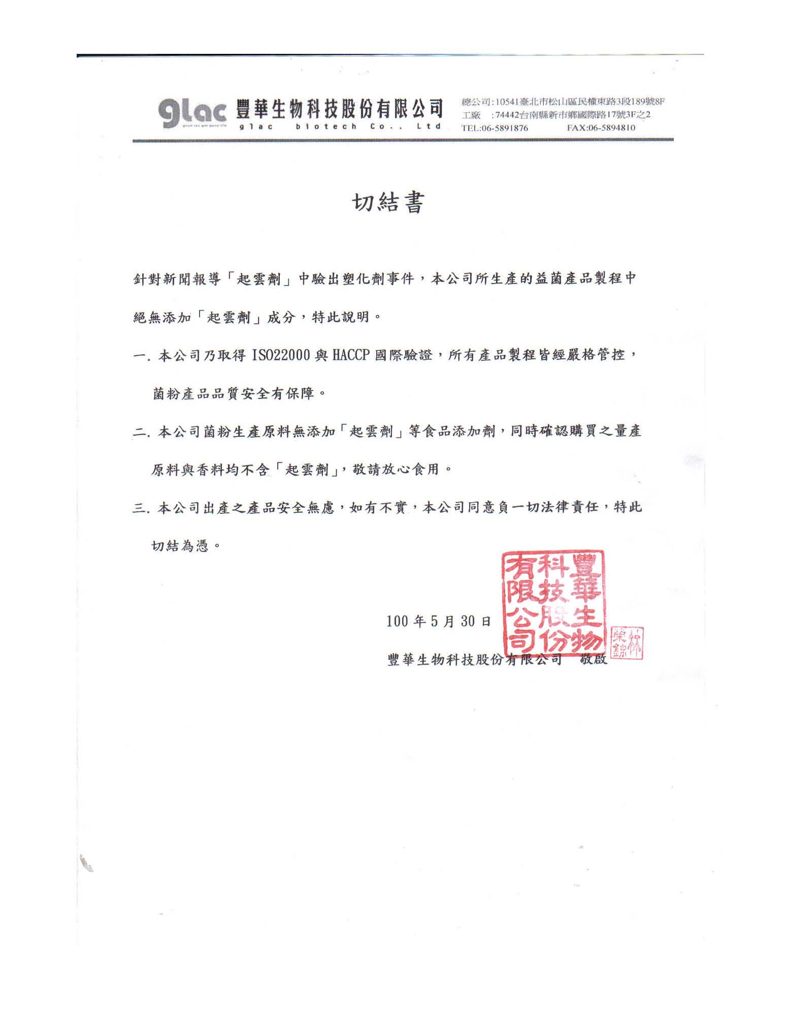 Plasticizer is not approved by the Food Sanitation Law of Taiwan as a food additive. We certify that there is ... 針對食品添加物中「起雲劑」驗出含有塑化劑(DEHP)事件,本公司聲明å¦......