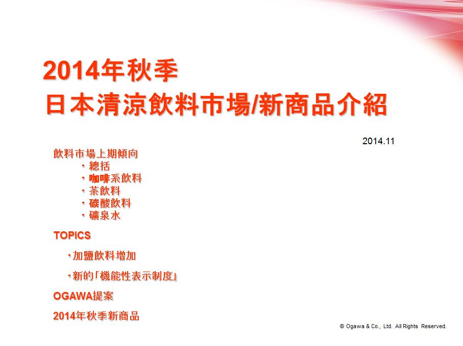 Japan's new product files have been uploaded to the download area, if you need any services, please contact us... 飲料市場上期傾向 – TOPICS - OGAWA提案 - 2014年秋季新商品...